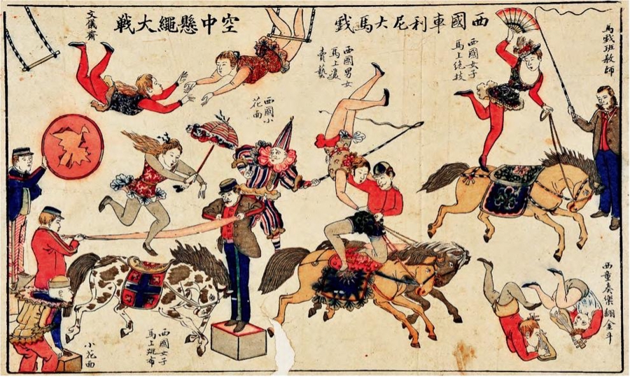 《西国车利尼大马戏 空中悬绳大战》文仪斋 上海小校场,上海博物馆藏