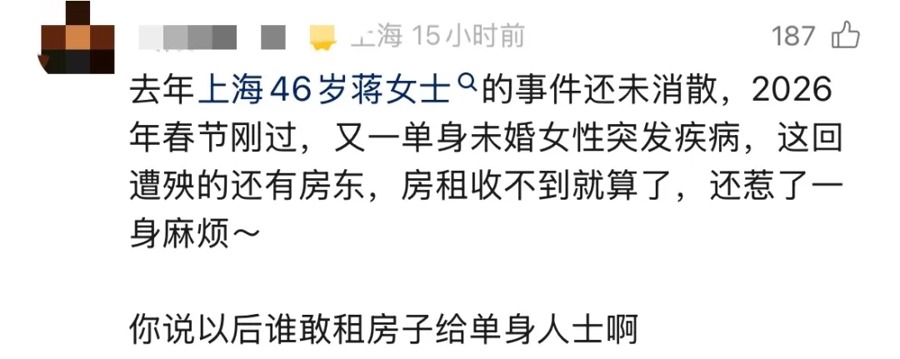 邓女士的遭遇像一面镜子,照出了无数独居者的隐忧。网友的留言,句句扎心:这种问题只会越来越多,年轻人也需要多考虑一步了。