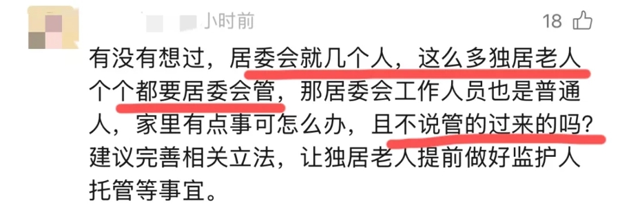 也有网友认为,居委会就几个人,现在这么多独居老人,管得过来吗?